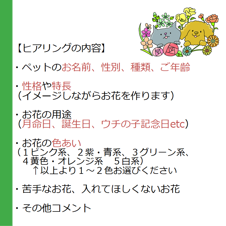 お花のイメージやご要望など、差支えない範囲でお伺いさせて頂き、オリジナル、オーダーメイドのお花をお作りしてお届け致します。ネットショップはどんなお花が届くかわからず、不安・・・そんな方にオススメです。