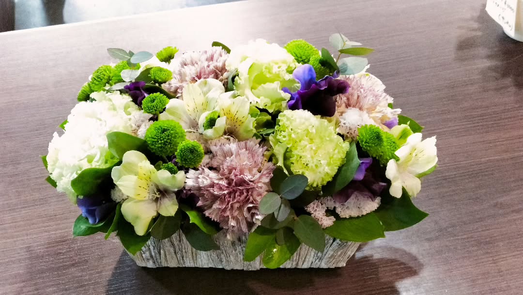 花を敷き詰めるようなスタイルは花びらが散りにくく、ながく手間なく飾って頂けます。